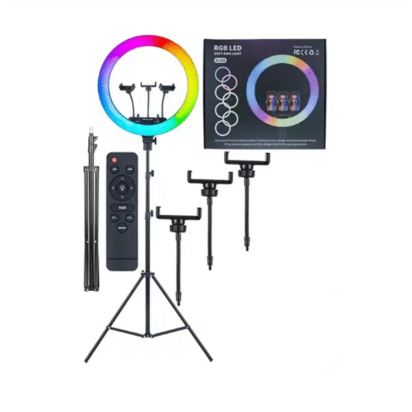Built for versatility, the MJ RGB Ring Light includes an adjustable tripod stand, universal phone holder, and remote control, giving you complete freedom and ease of use whether you’re filming, live streaming, vlogging, or taking selfies.