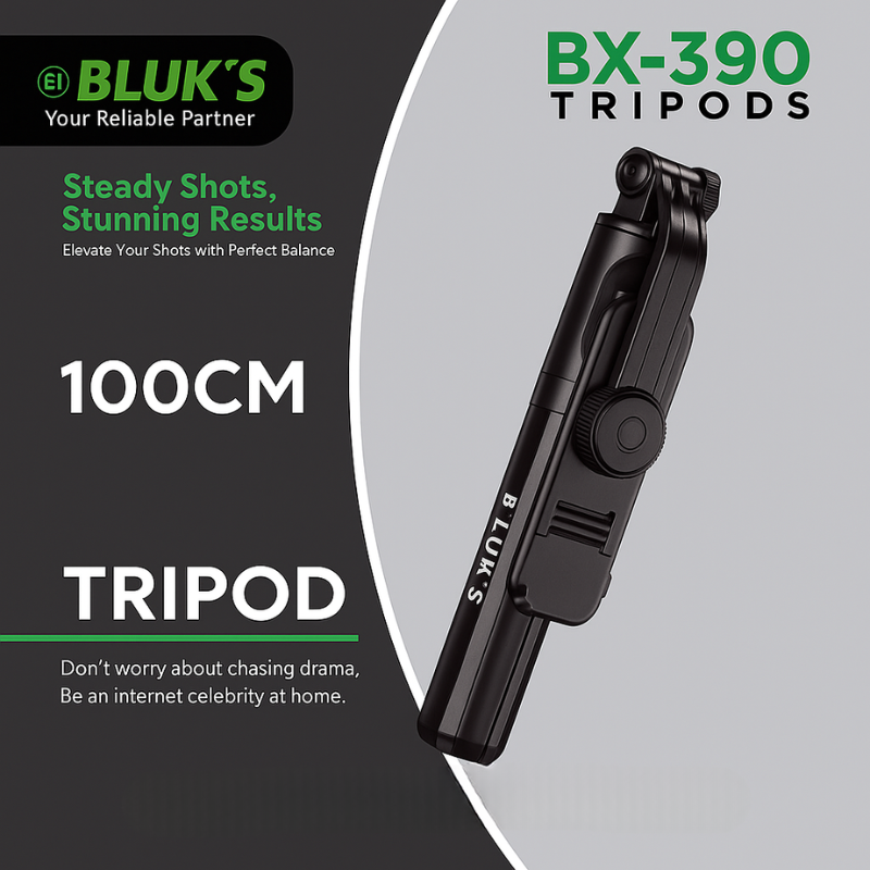 Capture every moment with the BLUK’S BX-390 Steel Selfie Stick + Tripod, a premium 2-in-1 accessory designed for photographers, vloggers, and travelers in Pakistan and beyond. Crafted from a durable steel body, this versatile tool extends up to 700mm and seamlessly transforms into a stable tripod for hands-free shooting. Equipped with a wireless Bluetooth remote and a 360° rotatable phone holder, it ensures effortless control and flexible angles for selfies, group photos, vlogging, and live streaming. Lightweight, foldable, and universally compatible with smartphones like iPhone and Samsung, the BX-390 is your go-to solution for professional-quality content creation on the go.