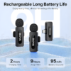 - Long-Lasting Battery Life: Up to 9 hours of continuous use per transmitter (95mAh battery), with USB-C charging for quick top-ups (about 2 hours to full). The receiver draws power directly from your device, so no extra batteries needed.