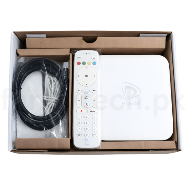 This is the original Etisalat eLife 4K Ultra HD Android TV Box (Model DWI259S, Android-based), now fully unlocked and professionally modified! It has been transformed into a powerful versatile smart IPTV streaming device that supports thousands of live TV channels from around the world – including Pakistan, India, Arab countries, Europe, USA, UK, Canada, Australia, Turkey, France, Germany, and many more (sports like Bein Sports, Sky Sports; movies, news like CNN, BBC; entertainment, kids, religious, music channels, and much more).