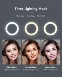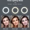 Customizable Illumination: The ring light features three lighting modes—typically warm, cool, and natural light (or varying brightness levels: low, medium, high)—allowing you to adapt the lighting to suit any environment or mood. Whether you need soft, flattering light for selfies or bright, clear illumination for video calls, this light delivers.