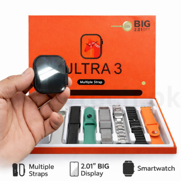 Upgrade your wrist game with the stylish Ultra 3 Smart Watch! Featuring a massive 2.01″ big infinite display 2.0 for crystal-clear visuals and smooth touch, plus Bluetooth calling with built-in mic & speaker – answer calls hands-free without touching your phone. Comes with 7 interchangeable multicolor straps to match any outfit or mood effortlessly.
