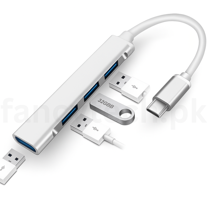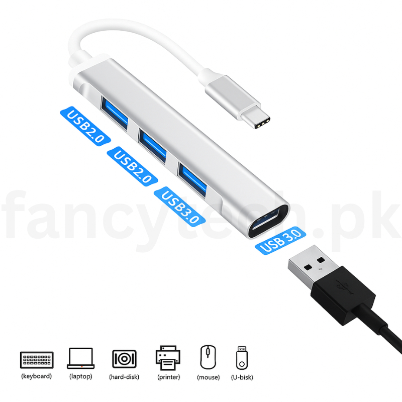 The USB-C to 4-Port Hub is a compact and versatile solution designed to expand the connectivity of your USB-C-enabled devices. This high-speed adapter transforms a single USB-C port into four USB ports, featuring one USB 3.0 port (5Gbps) and three USB 2.0 ports (480Mbps). Ideal for laptops, tablets, and smartphones with limited ports, such as MacBook Pro/Air, iPad Pro, Samsung Galaxy, or Windows devices, this hub enables seamless connection of peripherals like flash drives, keyboards, mice, external hard drives, and more. Its plug-and-play design and portable form factor make it perfect for professionals, students, and travelers needing reliable connectivity on the go.